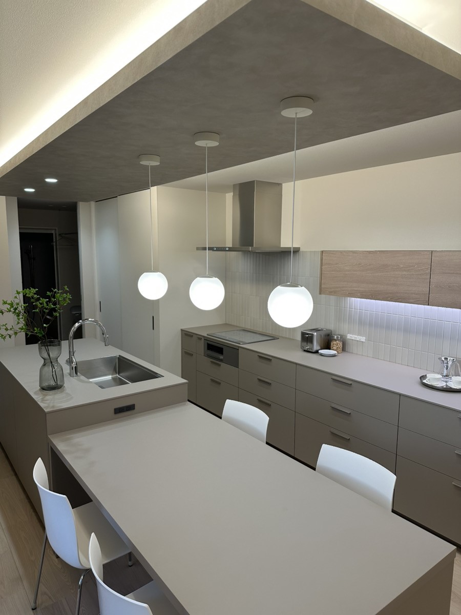 淡色好きにはたまらない、「アッシュベージュ」を基調とした、すっきりとしたデザインのアイランドキッチンに、