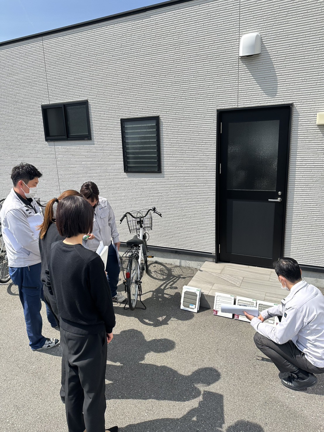 写真は外壁を選定している様子です。デザイン性はもちろん、周囲の街並みとの調和や耐久性なども考慮しながら、一つひとつ丁寧に決めていきます。