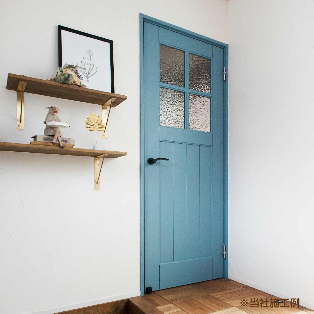 ブルーグレーの木製ドアやアールの垂れ壁、