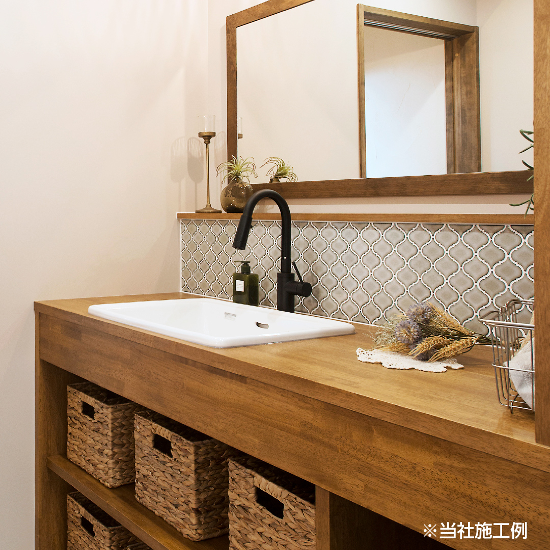 コラベルタイルを使った造作洗面台など、