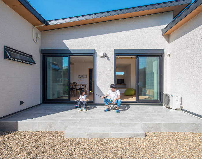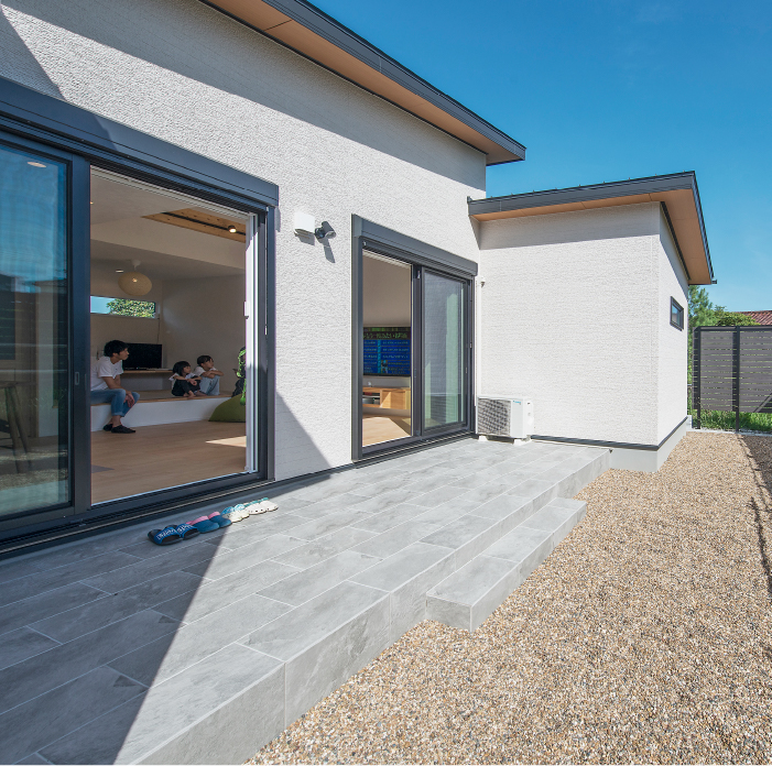生まれ育った地元に建てたのは、家族の未来に寄り添うナチュラルモダンな平屋。大きな窓と勾配天井が開放感を生み、家族がのびのびと過ごせる空間に。ひろびろとしたテラスではアウトドア気分も楽しめます。小上がり畳や便利な回遊動線など、日々の暮らしを支える工夫もたっぷり。“これからの暮らし”を見据えたF様の家づくりをご紹介します。