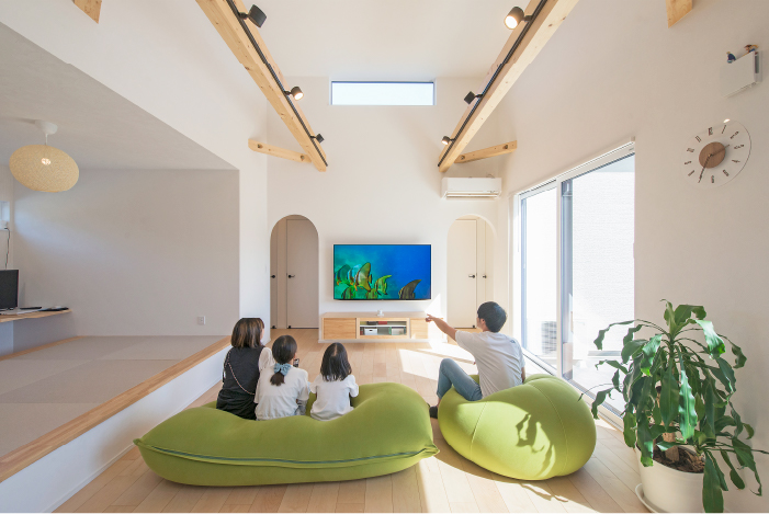 リビングの天窓から月や星が見えることもあるんですよ。「今日は星がきれいやなぁ」とロマンチックな会話を楽しめるのも、この家ならでは。夜は電気を消して月明かりを眺めるのが、家族のお気に入りの時間です。