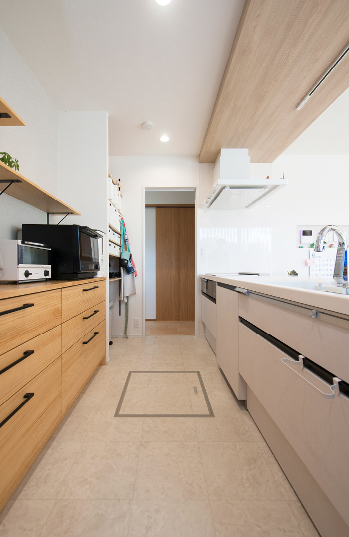 間取りは色々なパターンで悩みましたが、今の暮らしと将来を見据え、家族で話し合って決めました。リビングや水回りは回遊できる動線に。買い物帰りにはパントリーや冷蔵庫へ荷物をスムーズに運べて便利です。子供たちは帰宅後すぐに手洗いを済ませてからリビングに入れるようになっています。