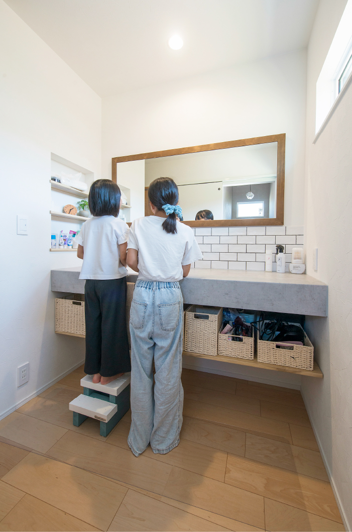 キッチンはフルフラットタイプで、子供たちとの会話もしやすいです。手元がオープンなので、カウンター上の整理整頓にも自然を気を配れるように。洗面台はアイカ工業のカウンターを採用し、予算を抑えつつ、かわいい造作洗面台を叶えることができました。キッチンや洗面などの設備は、コーディネーターさんと一緒にショールームに何度も足を運び、実物を見てじっくり選べたのも良かったです。